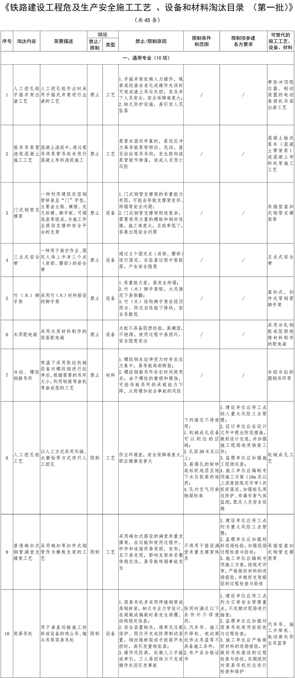 为防范化解铁路重大事故隐患,推动铁路建设领域淘汰落后工艺、设备和材料,提升本质安全水平,根据《中华人民共和国安全生产法》《建设工程安全生产管理条例》等法律法规,国家铁路局组织制定了《铁路建设工程危及生产安全施工工艺、设备和材料淘汰目录(第一批)》(以下简称《淘汰目录》),现予发布。