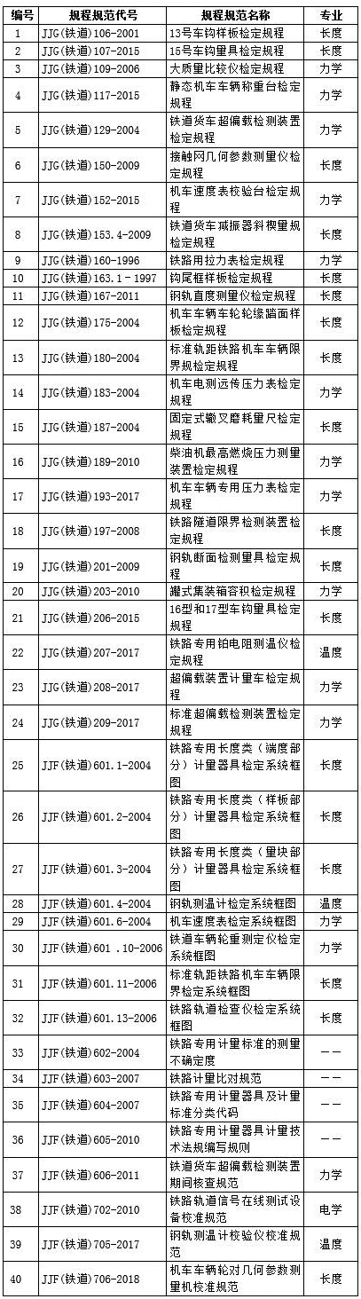为加强铁路部门计量规程规范的管理,按照政企分开改革的要求,国家铁路局组织对铁路部门计量规程规范进行了复审。以下40项铁路部门计量规程规范保留。