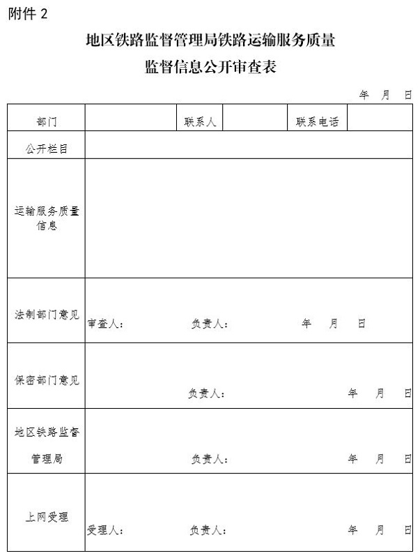 地区铁路监督管理局公开的铁路运输服务质量监督信息,经地区铁路监督管理局法制部门、保密部门审核,报局领导审定后在政府网站公开。《地区铁路监督管理局铁路运输服务质量监督信息公开审查表》见附件2。