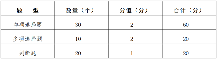 1.试题类型包括:单项选择题、多项选择题、判断题,全部为客观题。多项选择题中,全部选对得2分;少选,所选的每个选项得0.5分;多选、错选不得分。题型数量及分值见下表。