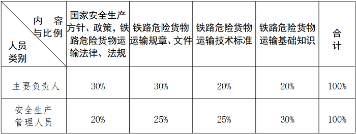 国家安全生产方针、政策和有关安全生产的法律、法规、规章及安全标准,铁路运输、危险货物运输相关法律、法规、规章、标准及文件(目录见附件),铁路危险货物运输企业和单位安全生产主体责任、安全管理知识、安全生产实务等内容。