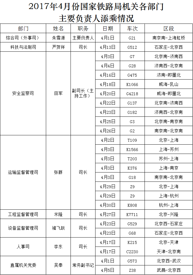 2017年4月份国家铁路局机关各部门主要负责人添乘情况