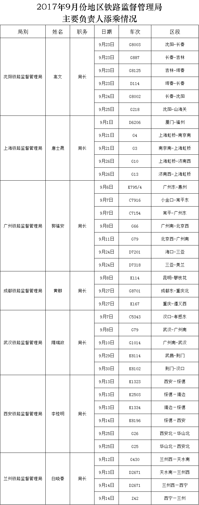 下一篇:2017年9月份地区铁路监督管理局主要负责人添乘情况