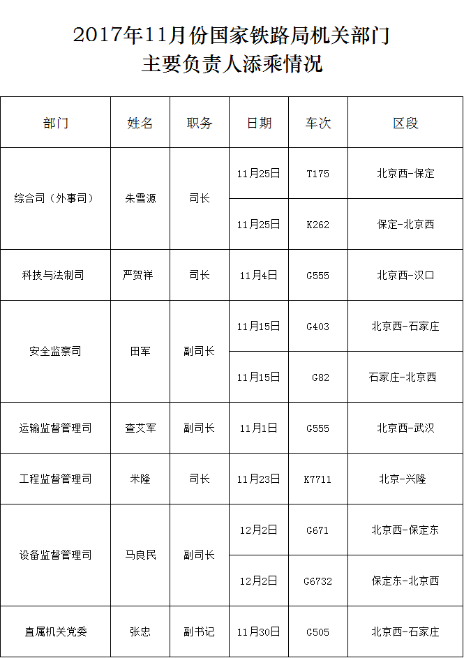 下一篇:2017年11月份国家铁路局机关部门主要负责人添乘情况