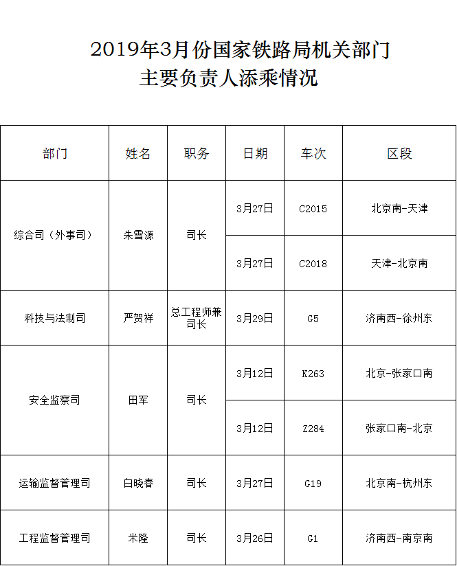 下一篇:2019年3月份国家铁路局机关部门主要负责人添乘情况