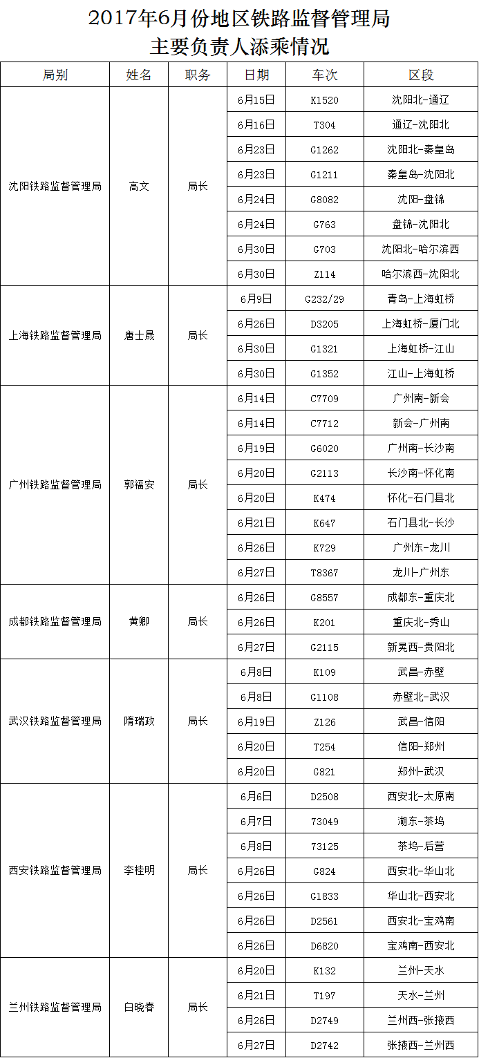 上一篇:2017年6月份地区铁路监督管理局主要负责人添乘情况