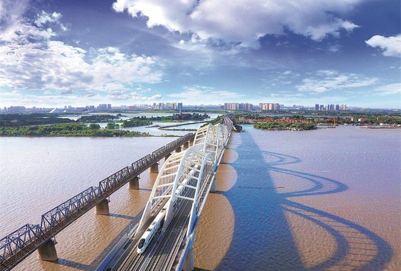 烟波浩渺的松花江上,世界首例四线系杆拱连续梁桥——哈齐高铁松花江特大桥横空飞越。不远处,滨洲线松花江铁路大桥静静伫立,凝望着云卷云舒、车来车往。这一望,就是114年。图为一列动车组列车在哈齐高铁松花江特大桥上驶过。画面左侧的滨洲线松花江铁路大桥建成于1901年,于2014年正式 “退役”,作为旅游观光景点被保留。