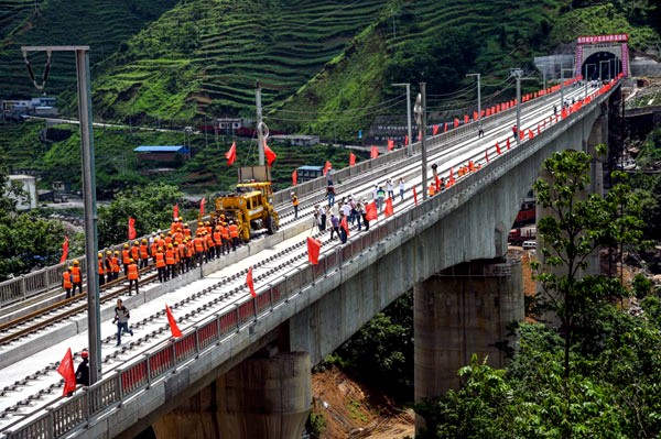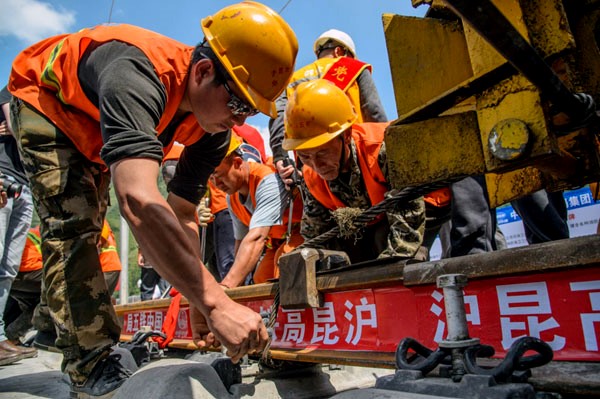 2016年5月31日,经过中铁五局员工8个月紧张建设,沪昆高铁贵州西段最后一段500米长钢轨顺利铺设至沪昆高铁全线第一长隧道壁板坡隧道洞口前,至此沪昆高铁贵州西段与云南段胜利接轨,为下半年联调联试和通车运营奠定坚实基础。图为铺轨车在施工现场铺设轨道。