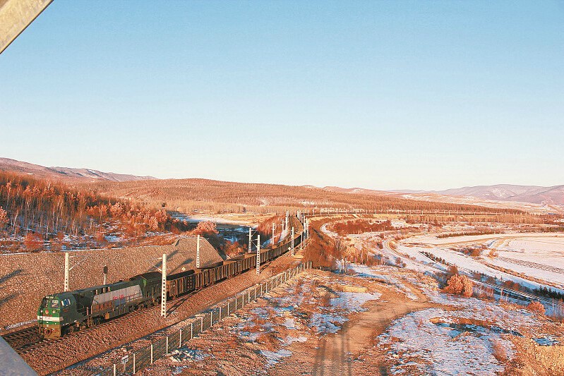 “黄继光号”机车牵引着重载列车行驶在滨洲线上。