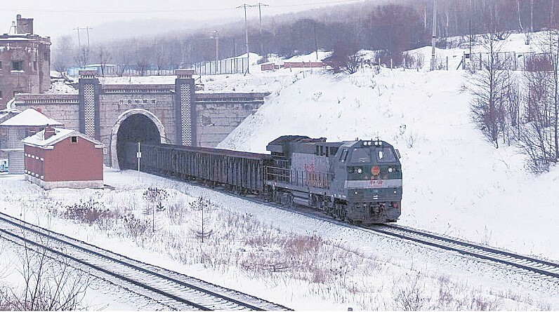 “黄继光号”机车牵引着重载列车驶出兴安岭隧道。