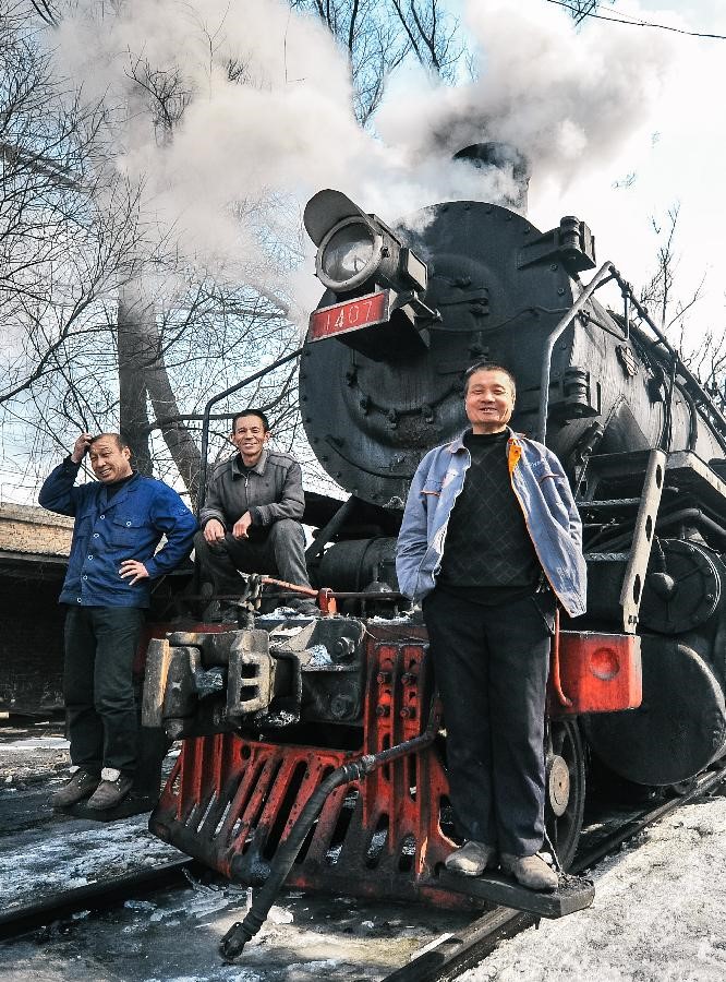 “上游1407”号车长郭金津(右)、副车长王迎春(左)、司炉工王立军(中)在车前合影。