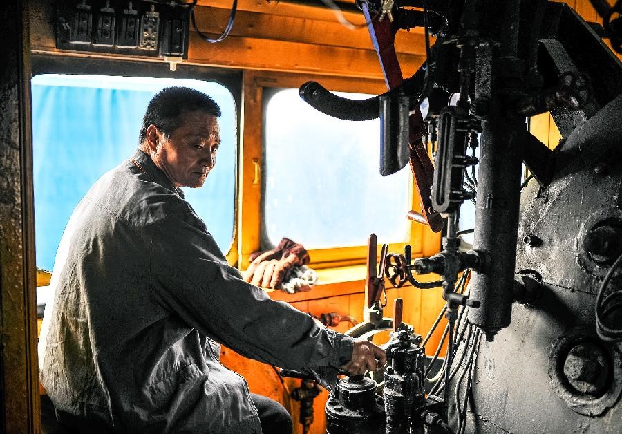 车长郭金津在驾驶火车。