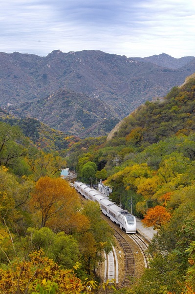 深秋,“长城号”动车组列车驶过位于八达岭长城和京张铁路交汇点的青龙桥车站。