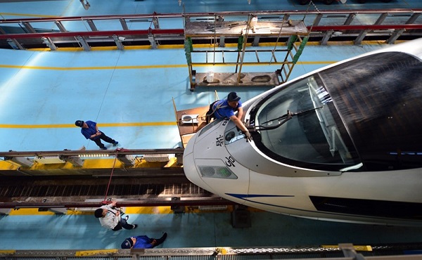 2014年9月26日,在沈阳沈北动车所,技术人员给高铁列车进行日常检修。