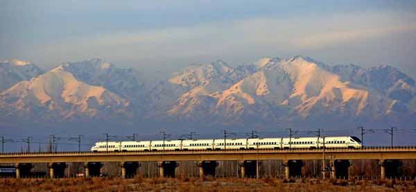 兰新高铁动车组列车在天山脚下行驶。