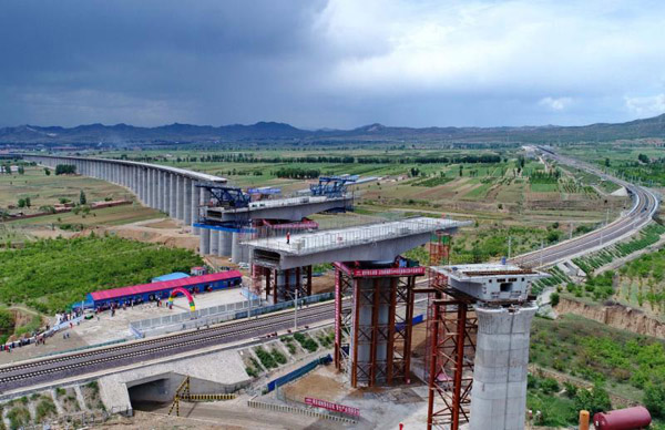 2018年6月13日,由中铁二十局承建的京张高铁崇礼支线张家口市宣化区赵川镇境内的跨唐呼铁路特大桥连续梁转体成功。