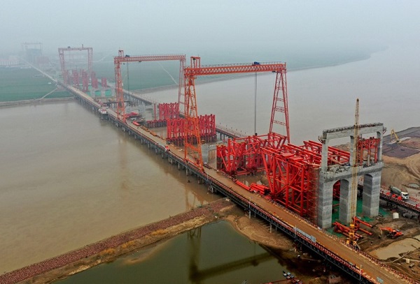 郑济高铁郑州黄河特大桥主桥及南引桥全长4377米,采用公路、铁路上下层合建的布置形式,设计4线铁路、6车道快速路。
