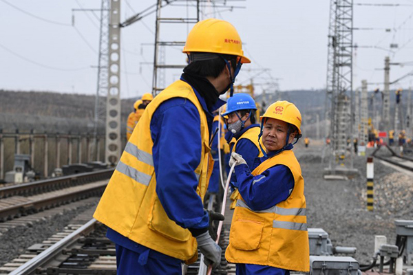 3月19日,工人们在唐呼线张集段古营盘站场进行换线作业。
