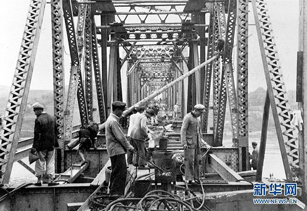 修建成渝铁路的工人们在紧张地架设沱江大桥。