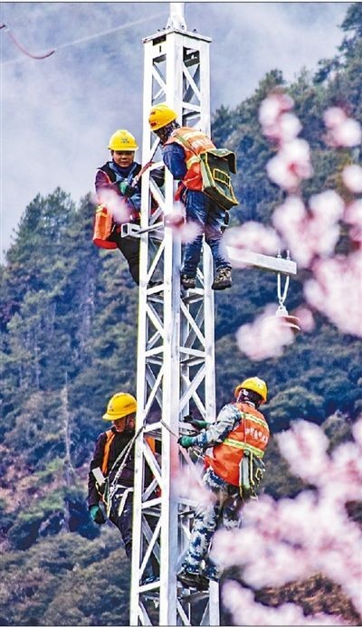4月2日,中铁电气化局集团的建设者在拉林铁路林芝至岗嘎区间进行棘轮框架安装。徐驭尧 王宝成摄影报道