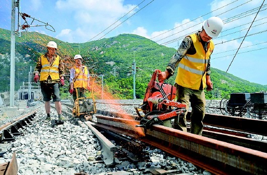 7月28日,在福州长乐松下站工地,施工人员将最后一根长轨换铺到位,标志着福(州)平(潭)铁路全线铺轨贯通。