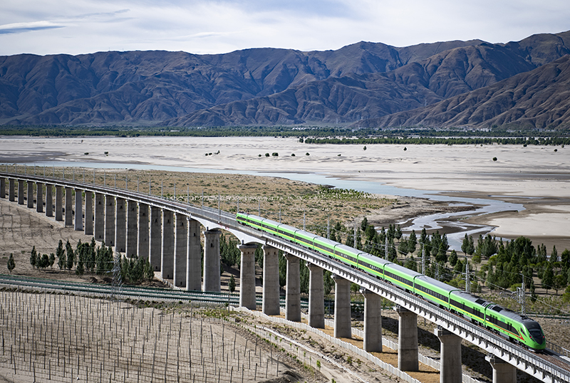 试运行的复兴号列车行驶在雅鲁藏布江畔(6月16日摄)。