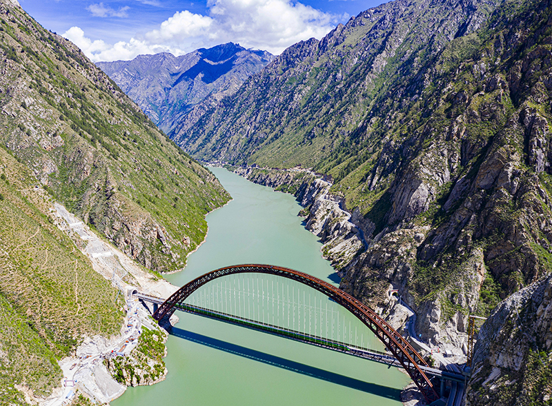试运行的复兴号列车行驶在藏木特大桥(6月17日摄,无人机照片)。