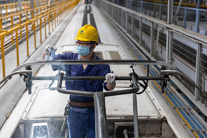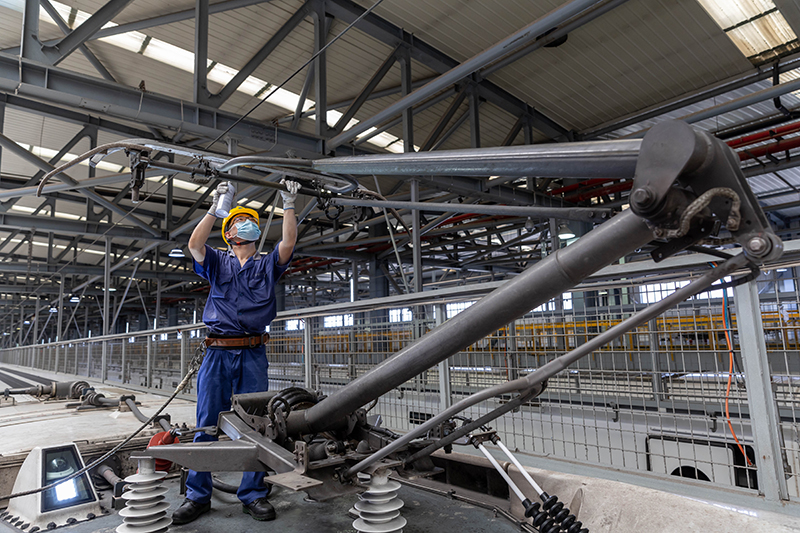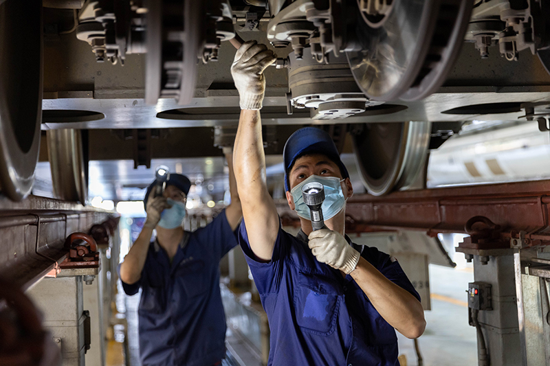 暑运期间,上海虹桥动车运用所内一派繁忙。被称为“高铁医生”的动车组机械师对复兴号动车组的“脚”——走行部件、“心脏”——高压牵引部分、“身体”——车内服务设施等进行细致检修和维护,确保暑运期间列车运行安全。