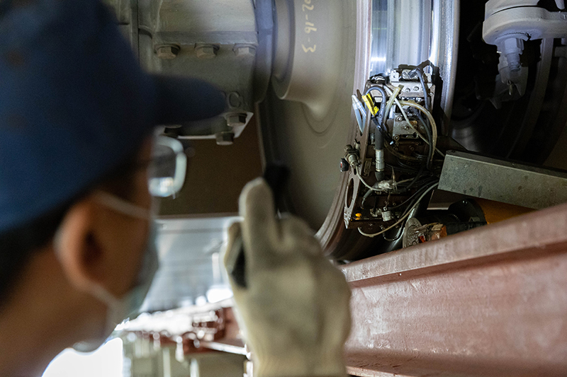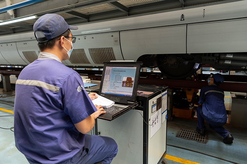 动车组机械师对动车组转向架进行检查。