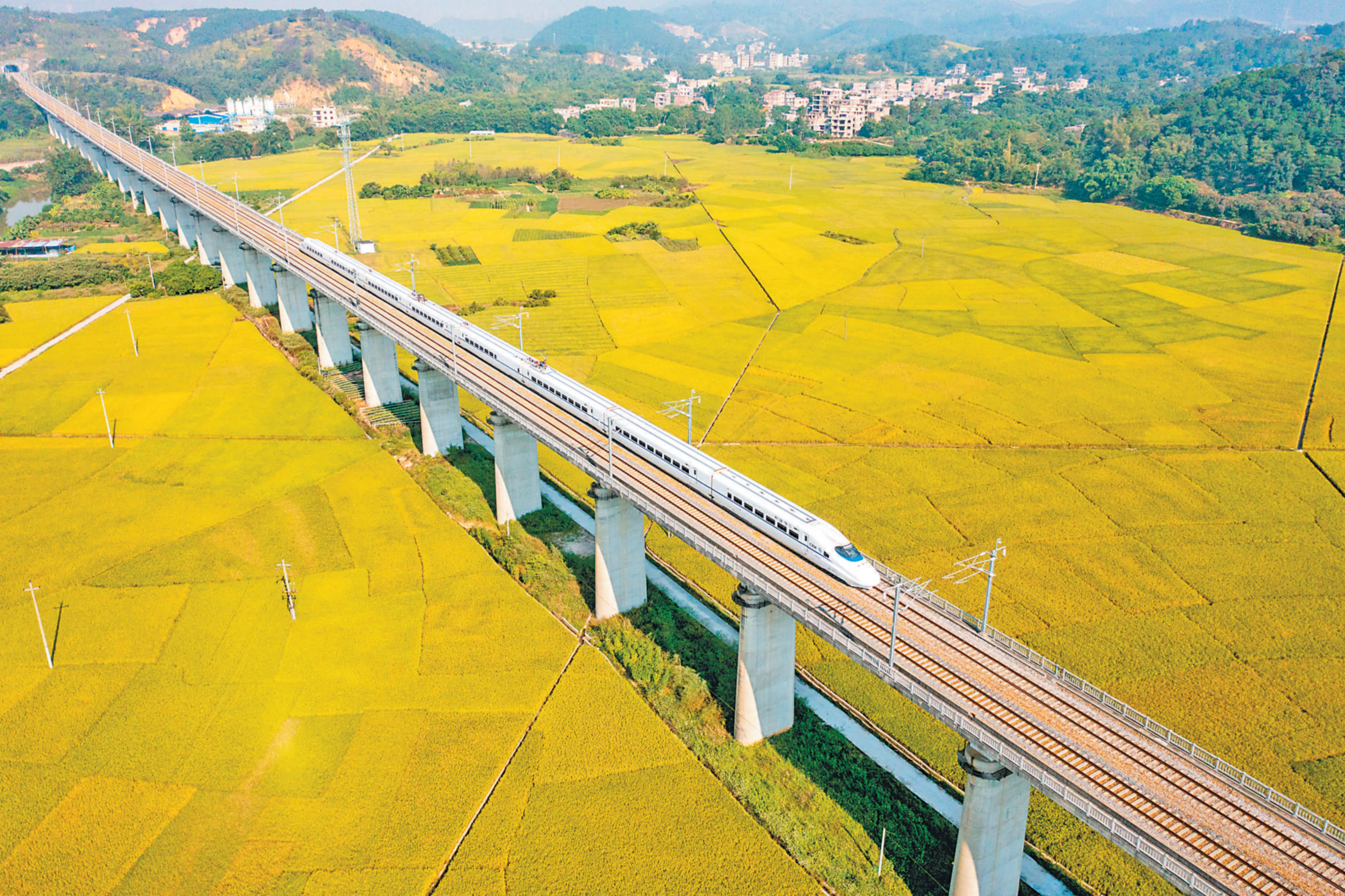 金秋时节,广西壮族自治区梧州市的水稻陆续进入开镰收割期,田野呈现一派丰收美景。图为10月22日,梧州市龙圩区大坡镇河步村,一辆动车穿行于金色稻田之上。