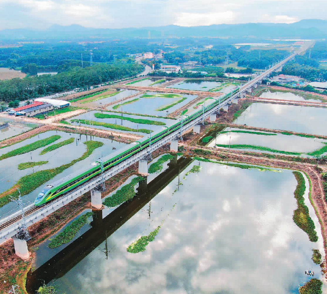 “复兴号”列车行驶在云南省景洪市境内的中老铁路橄榄坝特大桥上。