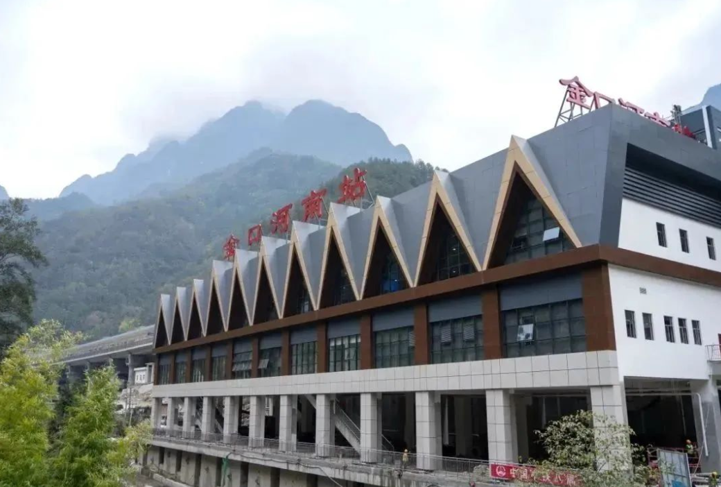 金口河南站位于乐山市金口河区共安彝族乡象鼻村。站房轮廓结合当地巍峨的山谷元素设计,建筑色彩从当地彝族传统服饰提炼而来,彰显地域文化。