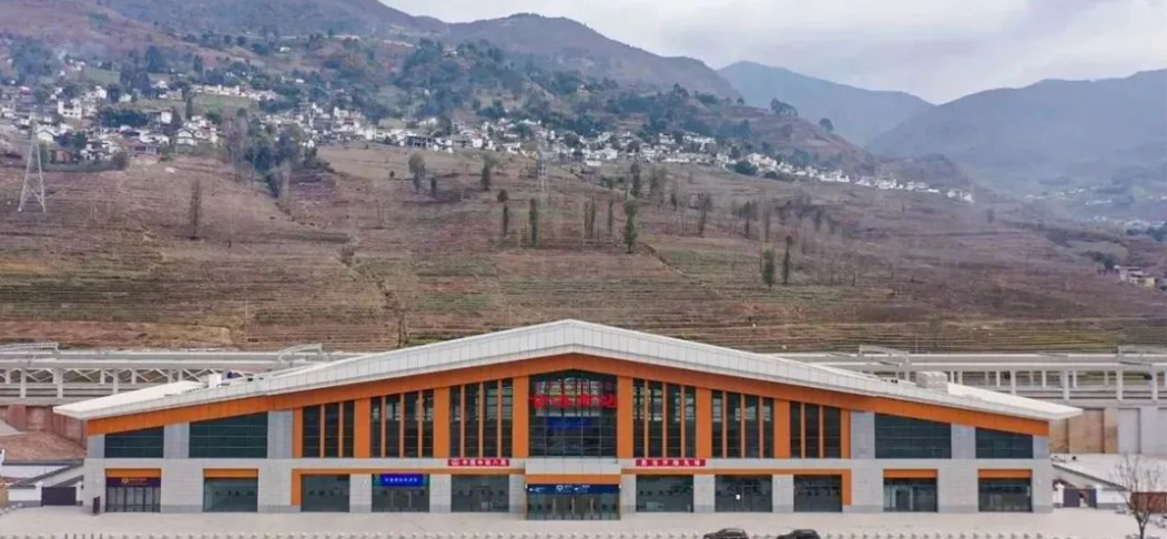 喜德西站位于凉山彝族自治州喜德县新桥村。站房以“川南腹地,彝风彝彩”为设计理念,将彝族特色牛羊角元素融入屋顶设计。