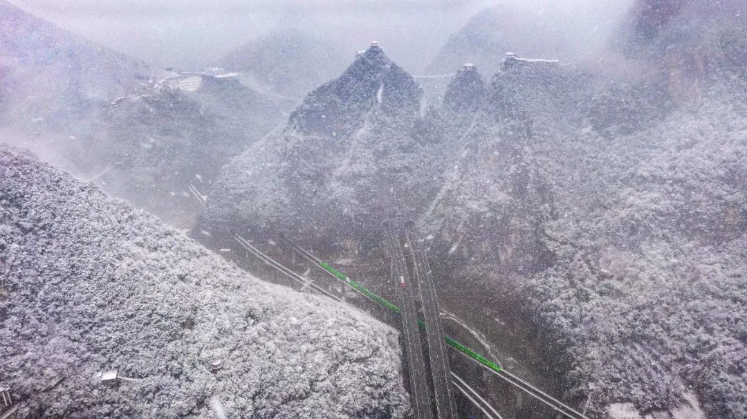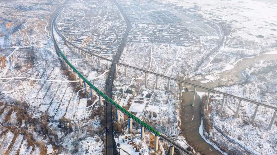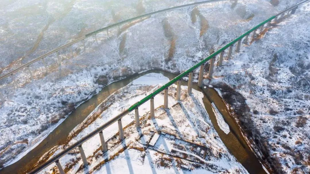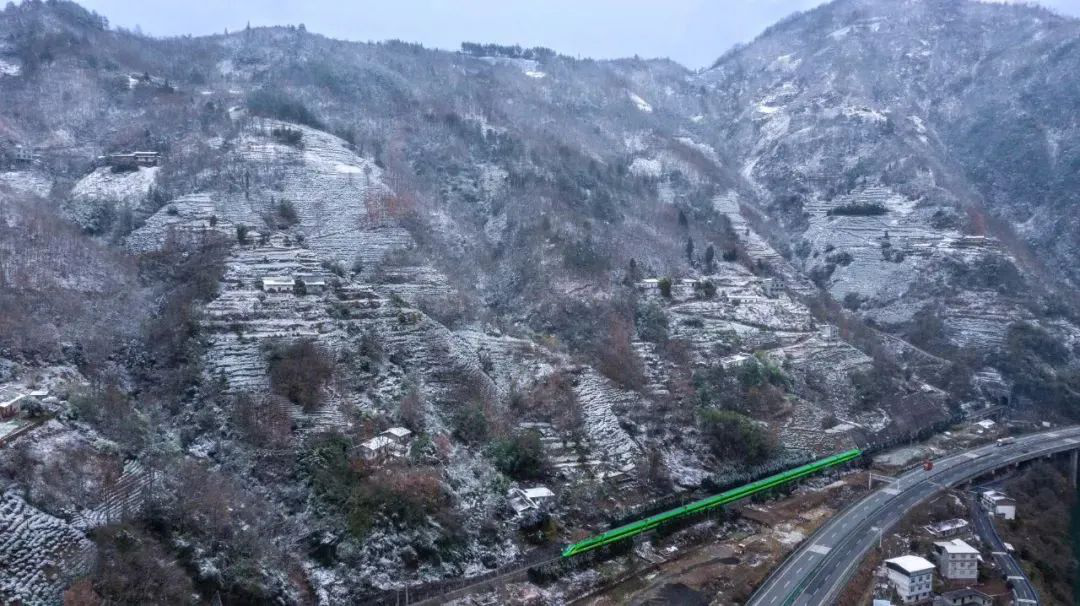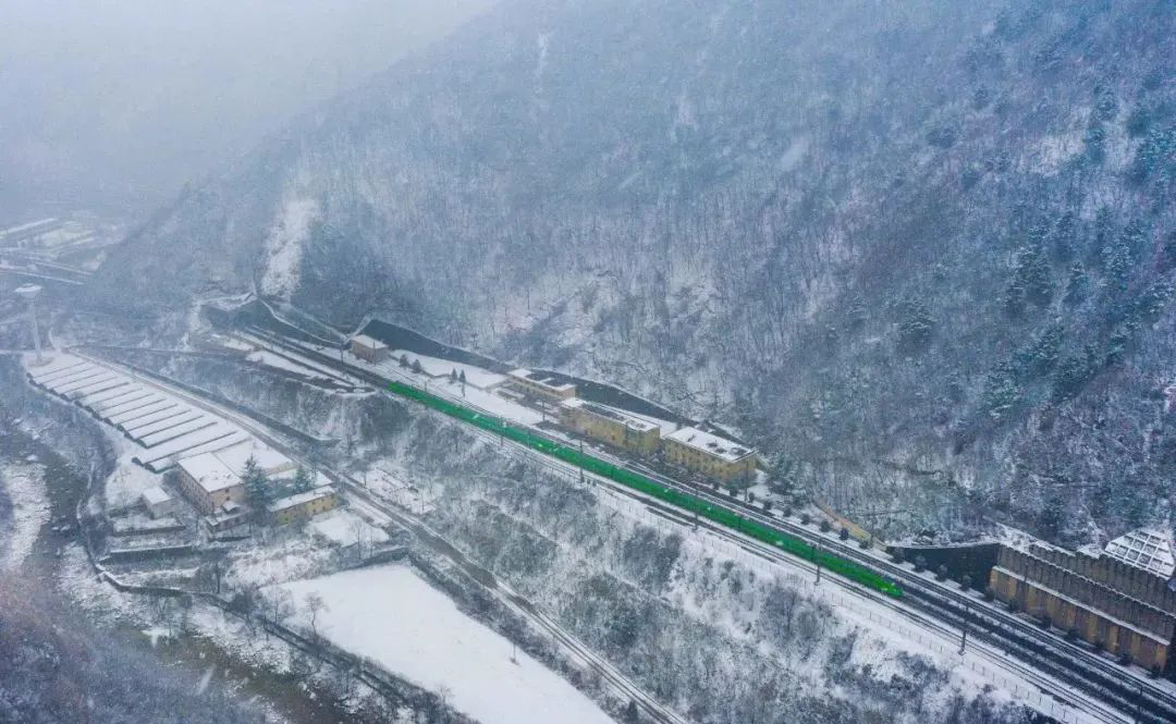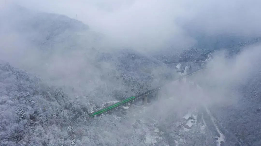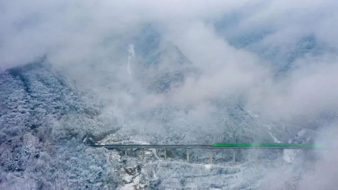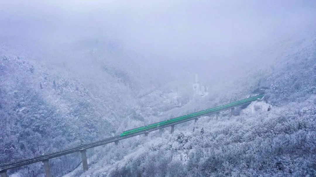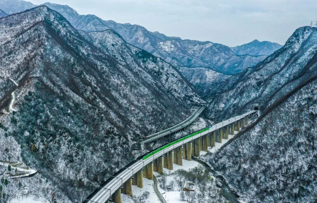 一辆复兴号动集动车组行驶在西康线终南山景区石砭峪大桥上。