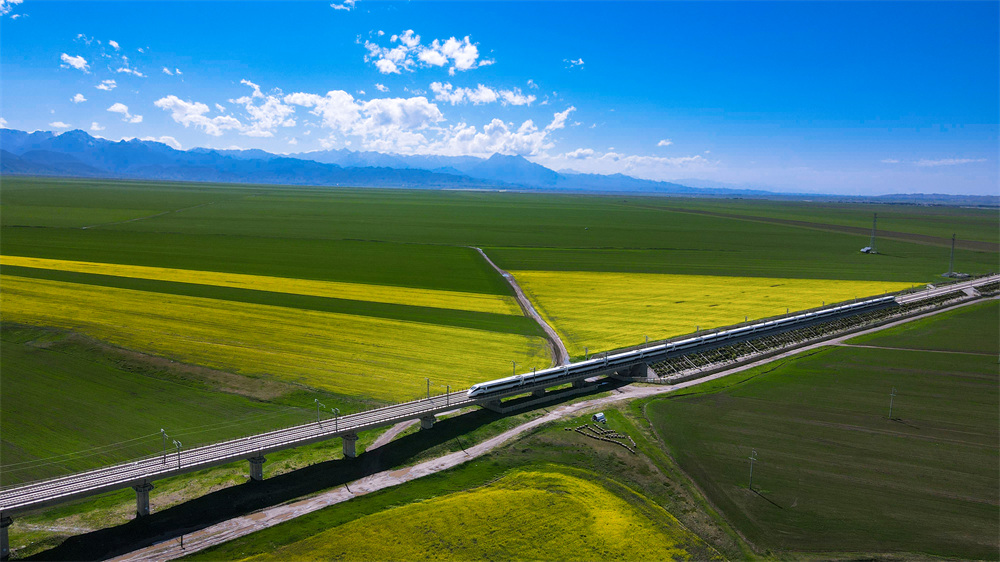 兰新高铁全长1786千米,东起兰州,途径青海西宁后穿越河西走廊,经张掖、嘉峪关后入疆。兰新高铁进入河西走廊后延绵的祁连山下牛羊成群,山川草甸绿意盎然,这条世界上一次性建成里程最长的高铁也被游客称为“最美高铁”。