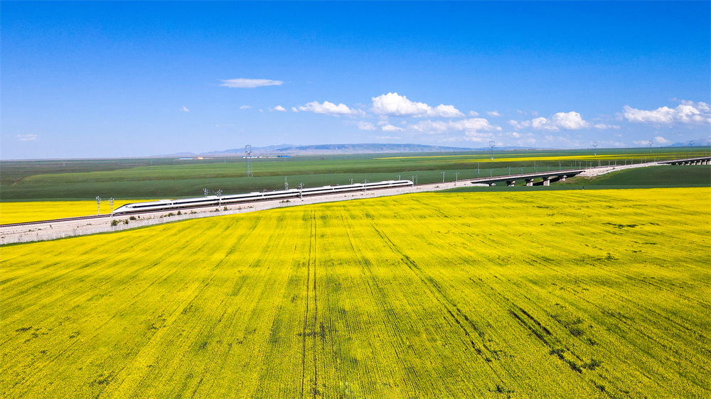 近日,河西走廊祁连山下的张掖市山丹县万亩油菜花竞相开放,列车飞驰在一望无际的油菜花海之间,美不胜收,令人心旷神怡。湛蓝的天空如同大海一般,洁白的云朵就像泛起的浪花,一望无际的油菜花像地毯一样铺在了河西走廊广袤的草场上,像一幅精美的油画,装饰着过往列车的车窗。