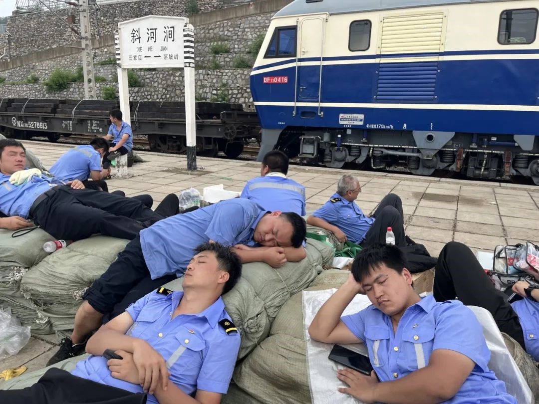 斜河涧站站台上,刚刚参与救援抢修的铁路职工正短暂休息。