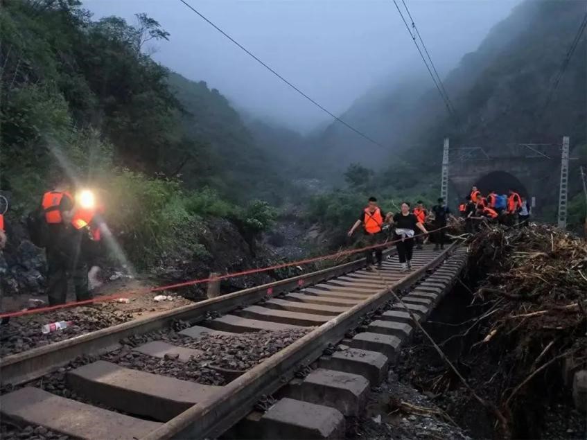 由于线路冲毁,K396次和Z180次列车上的旅客在铁路职工、蓝天救援队、武警战士和消防人员的共同帮助下,徒步6小时走出线路。
