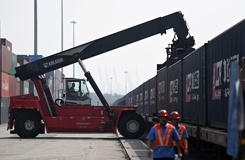 一列发往蒙古国乌兰巴托的中欧(中亚)班列在天津港进行集装箱吊装作业。