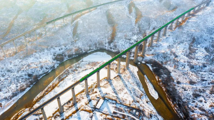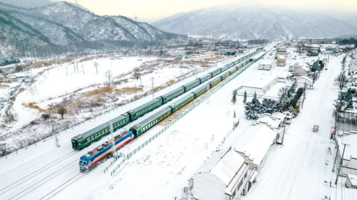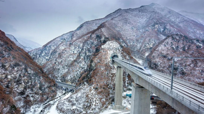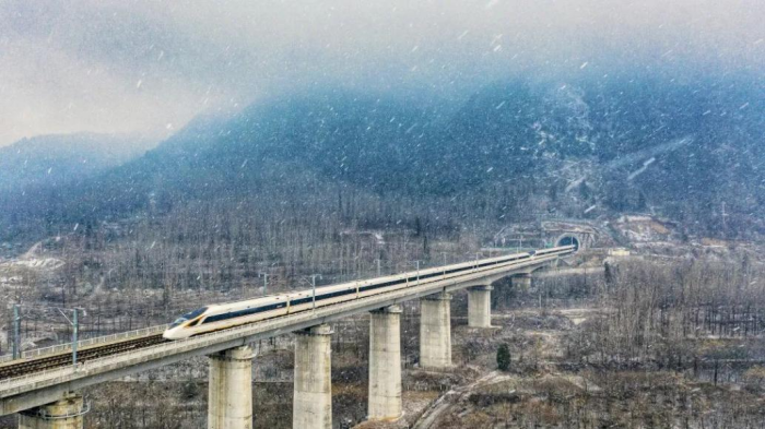 雪中,疾驰的列车穿过秦岭