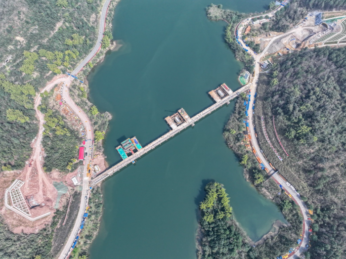 图为位于重庆市铜梁区的成渝中线高铁玄天湖大桥建设现场,工作人员在施工作业。
