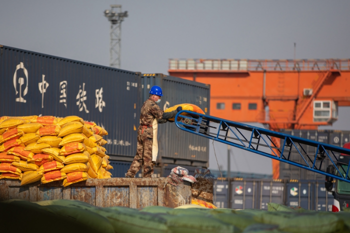3月13日,在中国铁路哈尔滨局集团有限公司大庆车务段肇东站货场,工作人员在装卸化肥。