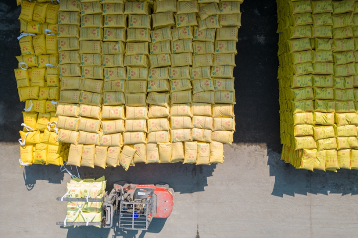3月13日,在中国铁路哈尔滨局集团有限公司大庆车务段肇东站货场,工作人员用叉车运送化肥。