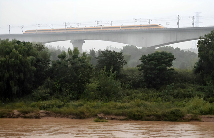 联调联试综合检测列车驶过位于陕西省西安市的西延高铁渭河特大桥。
