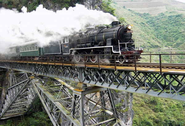 蒸汽机车行驶在人字桥上