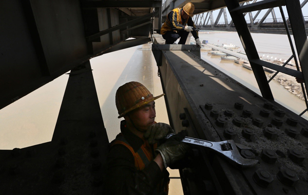作业工人在对长(垣)东(明)黄河大桥梁体进行加固维修。