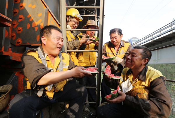 工闲小憩,为防暑降温,工区还送来了红瓤沙甜的大西瓜。