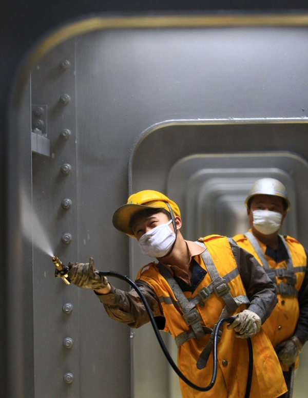 连地黄河钢梁大桥上,作业工人在钢梁桥顶部进行喷漆作业。