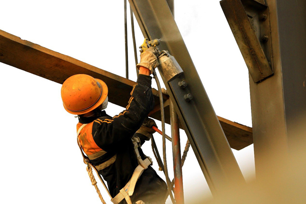踩在高空中狭小的踏板上,作业工人就像全副武装的蜘蛛人。
