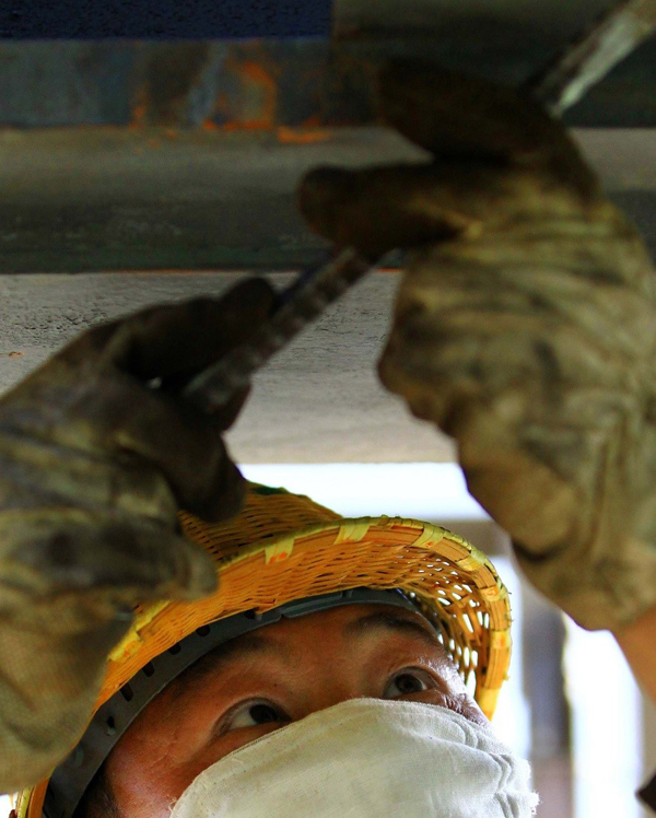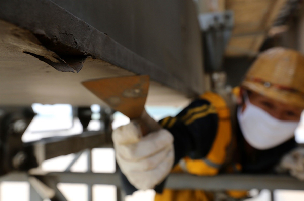 除锈的过程,必须全神贯注,不能放过任何一小块锈迹,因为那都可能威胁到大桥的安全。